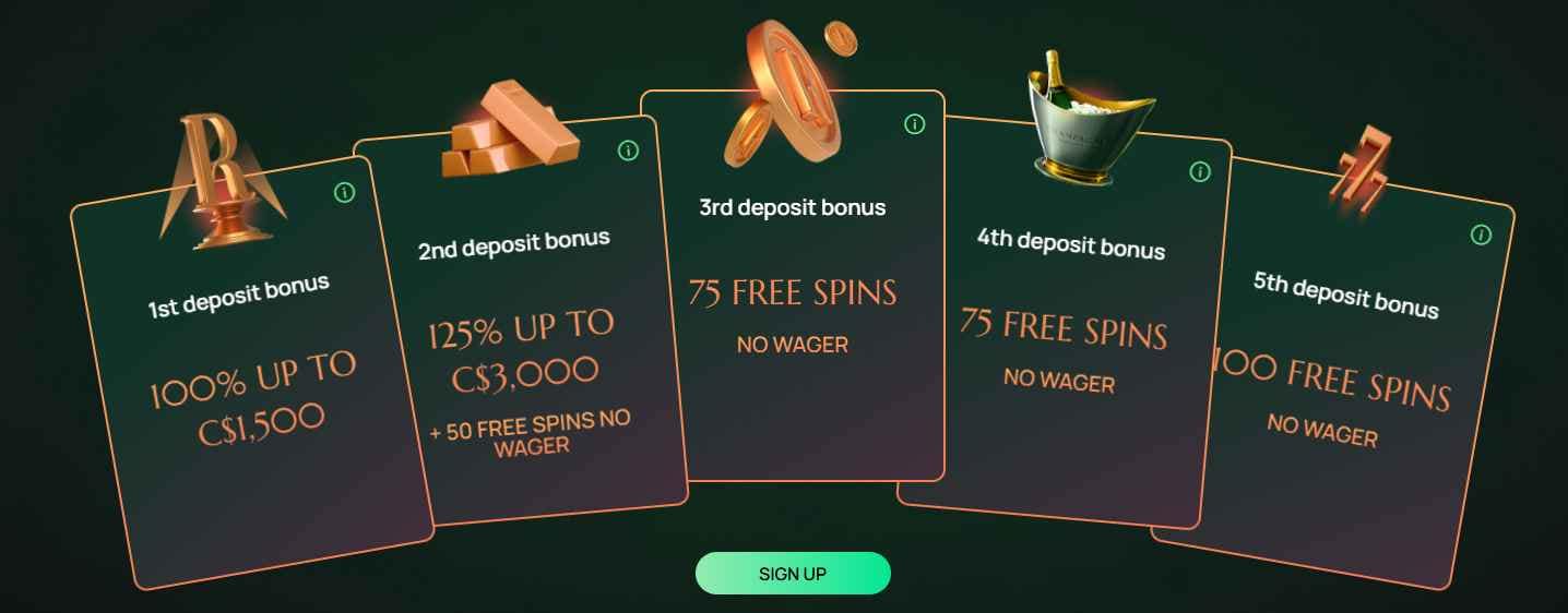 A five-deposit welcome package worth up to C$1,000 plus 300 free spins in total. New players can also grab 3 free spins just for registering — no deposit needed.