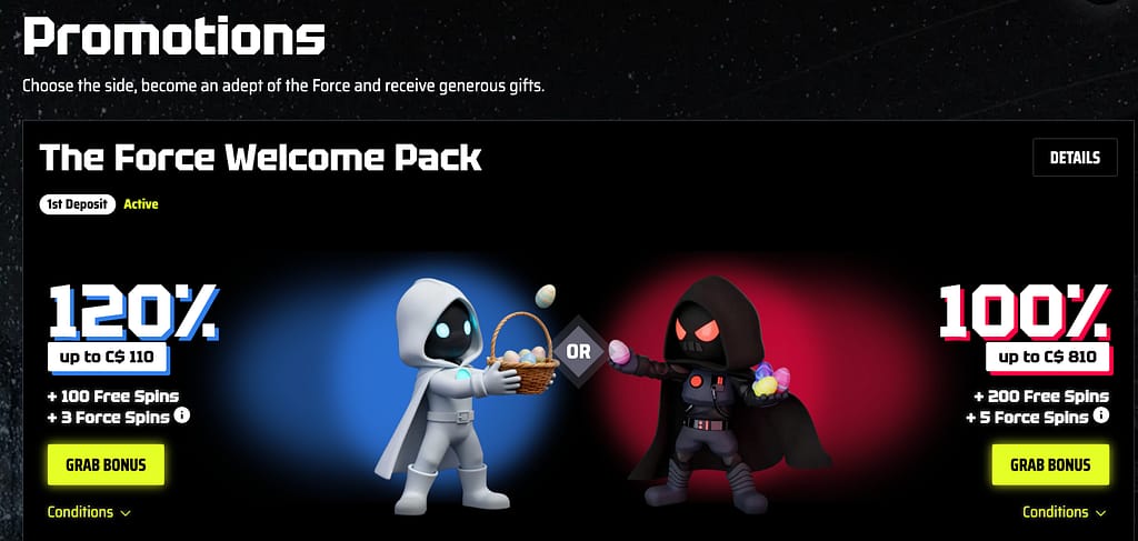 When Canadian players make their first deposit, the Light side gives a 120% bonus up to C$110, 100 SlotsVader free spins, and 3 additional Force Spins. The Dark side offers a 100% bonus up to C$810, plus 200 free spins and 5 Force Spins. There’s also a separate VIP offer for larger deposits: depositing more than C$750 gives a VIP status, a personal manager, and a larger bonus package.